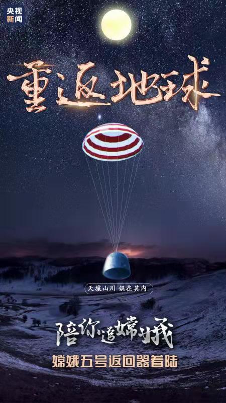 記者從國家航天局獲悉,北京時間12月17日1時59分,探月工程嫦娥五號返回器在內蒙古四子王旗預定區域成功着陸,標誌着我國首次地外天體採樣返回任務圓滿完成。