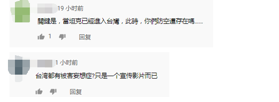 也有人説,“關鍵是,當坦克已經進入台灣,此時,你們防空還存在嗎……”“台灣都有被害妄想症?只是一個宣傳影片而已。”