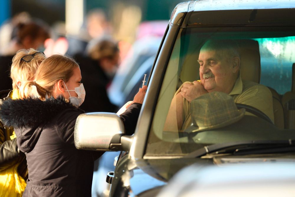 12月17日,在英國海德一處“免下車”疫苗中心,一名男子在車中接種疫苗。(新華社/法新)