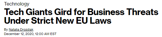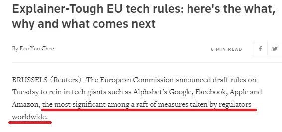 歐盟委員會日前發佈《數字市場法案》和《數字服務法案》兩部數字法草案。這是歐盟近20年來在數字領域的首次重大立法,被路透社稱為“全球範圍內最重要的監管措施”。
