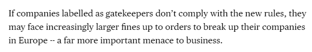 彭博社稱,新法案一旦正式生效,勢必會對這些巨頭在歐洲的經營方式產生重大影響。今後如果有科技巨頭違反新法規定,其歐洲業務將被最高處以年營業額10%的鉅額罰款,甚至被強行拆分或被要求出售部分歐洲業務。