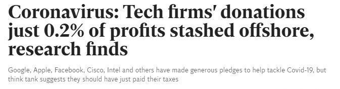 智庫機構“英國税務觀察”(TWUK)研究發現,雖然谷歌、蘋果、臉書等大型科技公司承諾會幫助解決疫情帶來的相關問題,並做過一些捐贈,但這些捐贈僅佔它們在“避税天堂”所賺鉅額海外利潤的0.2%。