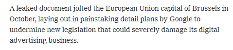 由於新法還須經歐盟各國審批方可生效,有人擔心這些科技巨頭們會藉機通過大規模遊説對最終法律條文施壓影響。事實上它們確實這麼幹了。一份不久前泄露的文件詳細列舉了谷歌等公司破壞歐盟兩項數字立法的計劃,震驚了歐盟。