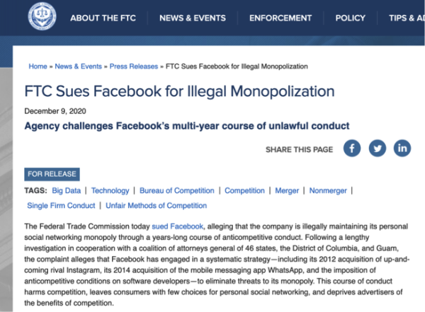 △美國聯邦貿易委員會官網發佈起訴臉書公司的相關消息