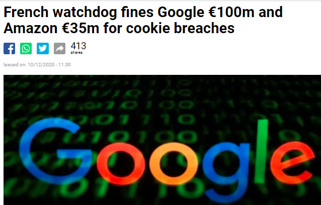 不僅如此,法國政府還在歐盟公佈新法草案的幾天前,對美國谷歌公司及其下屬企業和亞馬遜公司分別處以1億歐元和3500萬歐元的罰款,理由是這兩家互聯網企業在未徵得用户同意的情況下擅自蒐集用户上網痕跡。