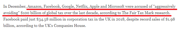 有錢不是錯,但要看錢是怎麼來的。英國“公平税標”組織(FTM)提供的數據顯示,亞馬遜、臉書、谷歌、蘋果和微軟等公司在2010年至2019年的十年間“積極逃避”了超過1000億美元的全球税收。