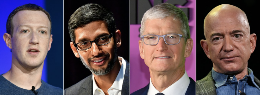 △從左至右依次是臉書CEO扎克伯格、谷歌CEO皮查伊、蘋果CEO庫克、亞馬遜CEO貝佐斯