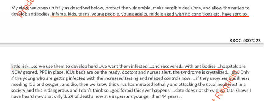 “政客”新聞網還報道稱,疫情期間,亞歷山大多次致信美國衞生官員説:“嬰幼兒、兒童、青少年、青壯年、沒有基礎疾病的中年人等,他們感染的風險很低或者為零。因此我們利用他們實現羣體免疫,我們想讓他們感染,並帶着抗體恢復。”