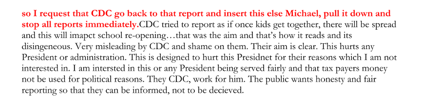 亞歷山大在郵件中寫道:“疾控中心的報告具有誤導性,我替他們感到羞恥。疾控中心發佈這樣的報告只是為了攻擊總統或者聯邦政府。如果這份報告要想出版,必須經過我的同意。我會對報告的內容進行調整,確保是公正、公平和完整的。”