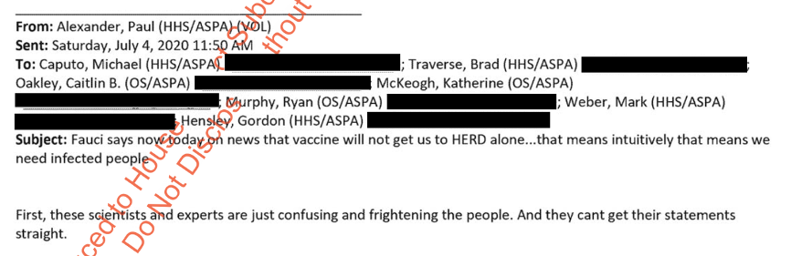 在7月4日的一封郵件中,亞歷山大批評衞生專家在媒體上警告公眾疫情擴散,“這些科學家和專家只是在迷惑和恐嚇人們。”