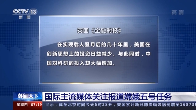 英國《金融時報》刊登題為《往返月球,中國研發正超越美國》的報道。文章指出,在實現載人登月後的幾十年裏,美國在創新思想上的投資日益減少。與此同時“中國對科研的投入卻大幅增加。事實上,美國國家科學基金會的一名官員在新聞發佈會上評論説,2019年的初步數據表明,目前中國的研發支出總額已超過美國。