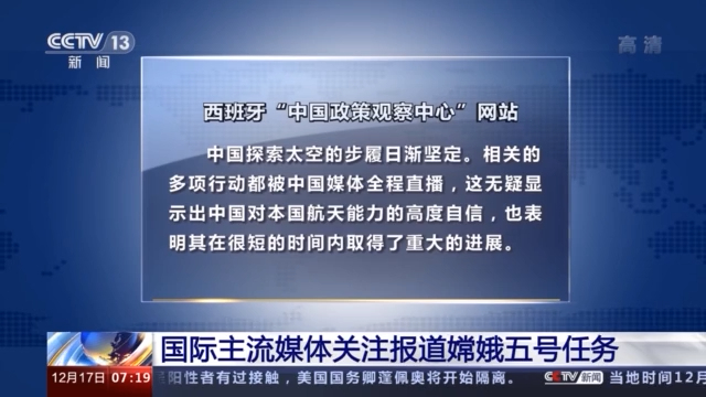 西班牙“中國政策觀察中心”網站發表文章説,中國探索太空的步履日漸堅定。相關的多項行動都被中國媒體全程直播,這無疑顯示出中國對本國航天能力的高度自信,也表明其在很短的時間內取得了重大的進展。