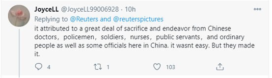 還有人表示,武漢能取得今天的局面是因為包括醫護人員、公務員、警察、軍人以及眾多普通民眾的巨大付出和對防疫工作的支持,他們一同經歷了嚴格的封鎖措施,所以他們換來了今天的自由。