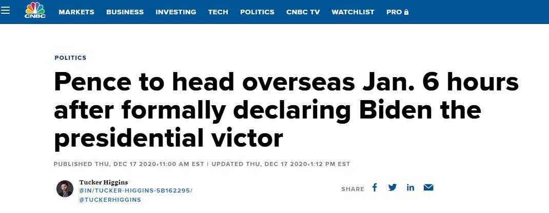【環球網報道 記者 侯佳欣】“1月6日正式宣佈拜登為大選獲勝者幾小時後,彭斯將前往海外。”美國消費者新聞與商業頻道(CNBC)17日以此為題報道稱,2021年1月6日,美國國會將舉行聯席會議正式清點選舉人票,當拜登拿到270票之後,副總統兼參議院議長彭斯就會正式宣佈大選結果。根據CNBC最新消息,彭斯宣佈結果的幾小時後,將開啓自己作為副總統的最後一次外訪之旅。