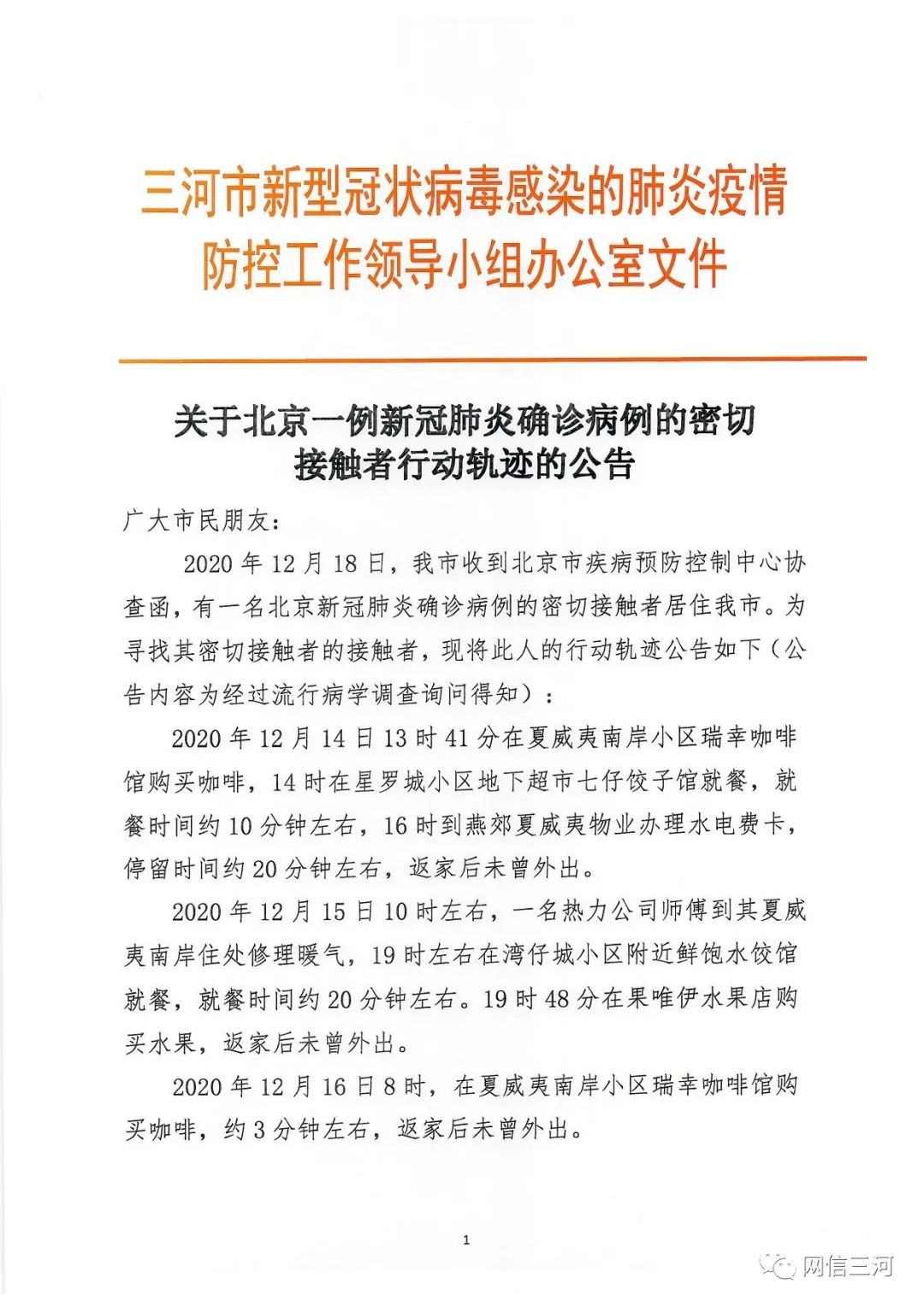 三河市公告北京一例新冠肺炎確診病例的密接者行動軌跡