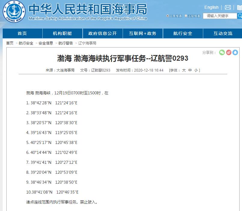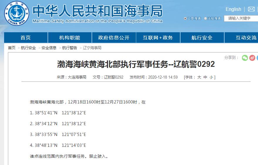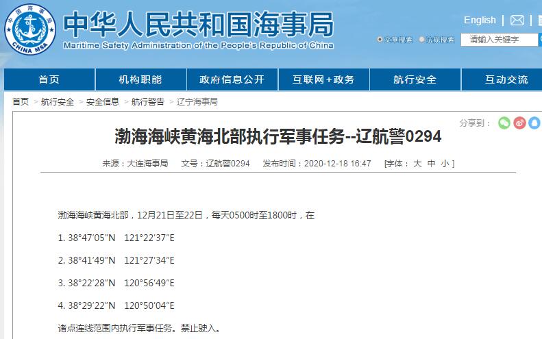 大連海事局:渤海部分海域執行軍事任務,禁止駛入