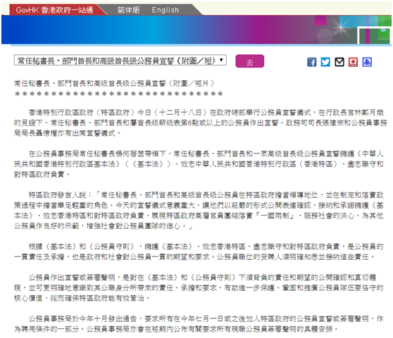 香港公務員事務局於今年10月發出通告,要求所有在今年7月1日或之後加入特區政府的公務員宣誓或簽署聲明,作為聘用條件的一部分。公務員事務局亦會在短期內公佈有關要求所有現職公務員簽署聲明的具體安排。