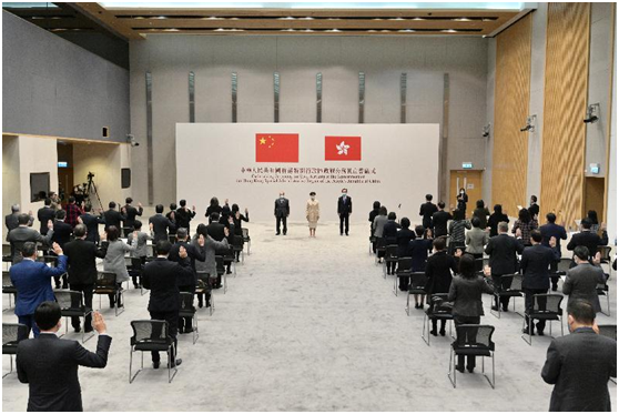【環球網報道 記者 趙友平】據港府剛剛發佈新聞公報,香港特別行政區政府(特區政府)今日(12月18日)在政府總部舉行公務員宣誓儀式,在行政長官林鄭月娥的見證下,常任秘書長、部門首長和屬首長級薪級表第6點或以上的公務員作出宣誓。香港政務司司長張建宗和公務員事務局局長聶德權亦有出席宣誓儀式。