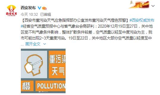 【西安市重污染天氣應急指揮部辦公室發佈重污染天氣橙色預警】#西安權威發佈#經省空氣質量預報中心與省氣象台會商研判:2020年12月19日至27日,關中地區受不利氣象條件影響,整體擴散條件較差,空氣質量以輕至中度污染為主,我市可能出現2~3天重度污染。19日至22日,關中地區大部分空氣質量以輕度至中度污染為主,其中21日至22日可能出現重度污染。23日區域大部分空氣質量以良至輕度污染為主。24日至27日,空氣質量以輕度至中度污染為主,其中26日至27日可能出現重度污染。