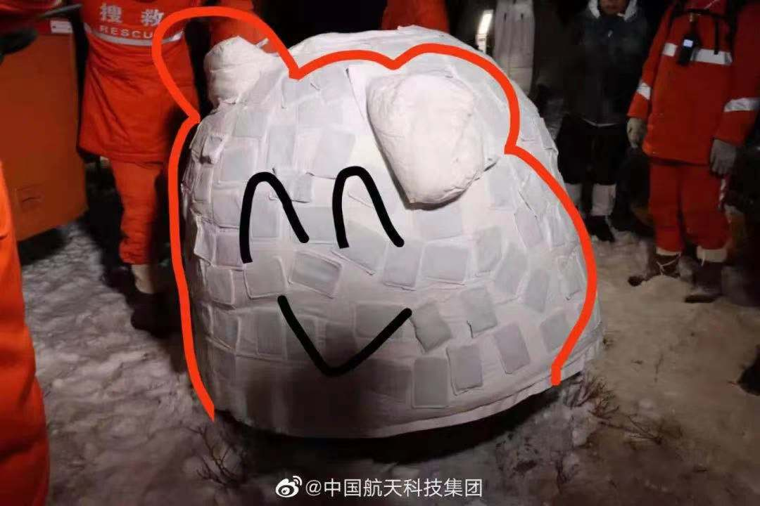 被地面搜索隊找到後,隊員們為“嫦五”返回艙全身上下貼滿了暖寶寶,使它多出了兩個萌萌的“耳朵”。