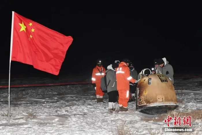 北京時間12月17日1時59分,嫦娥五號返回器在內蒙古四子王旗預定區域成功着陸,標誌着中國首次月球採樣返回任務圓滿完成。