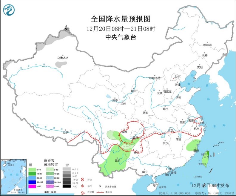 明天,西藏東北部、青海南部、甘肅西南部、川西高原北部、貴州西北部等地的部分地區有小雪或雨夾雪。西藏東南部、西南地區東部和南部、江南東部、台灣島東部等地的部分地區有小雨,局地中雨。