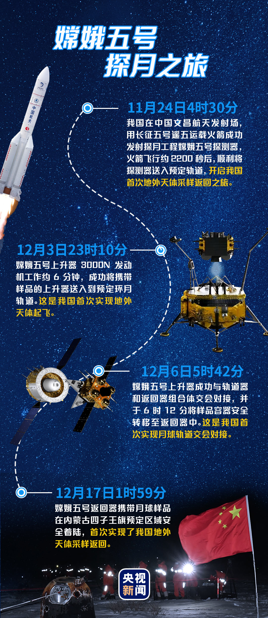10年時間裏,研製團隊披星戴月,日夜兼程,攻克了軌道設計、月面採樣封裝、月面起飛上升、月球軌道交會對接與樣品轉移、地球大氣高速再入返回等多個環節的技術難題,確保嫦娥五號在23天內順利完成各項任務。