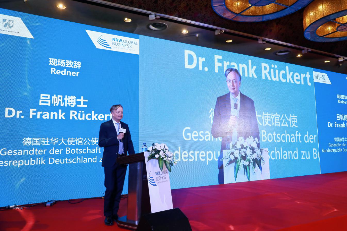 德國公使Frank Rückert博士受駐華大使葛策博士委託出席活動並致辭。他表示,北威州是德國經濟實力最強的聯邦州之一,擁有歷史上基礎發達的魯爾工業區,並在如今成功轉型為一座以機械製造和電子工業為重點的創新之州。北威州也是外國投資最活躍的區域,近20000家外國企業在此建立總部。相信北威州將成為綠地投資和企業落户的理想地點。