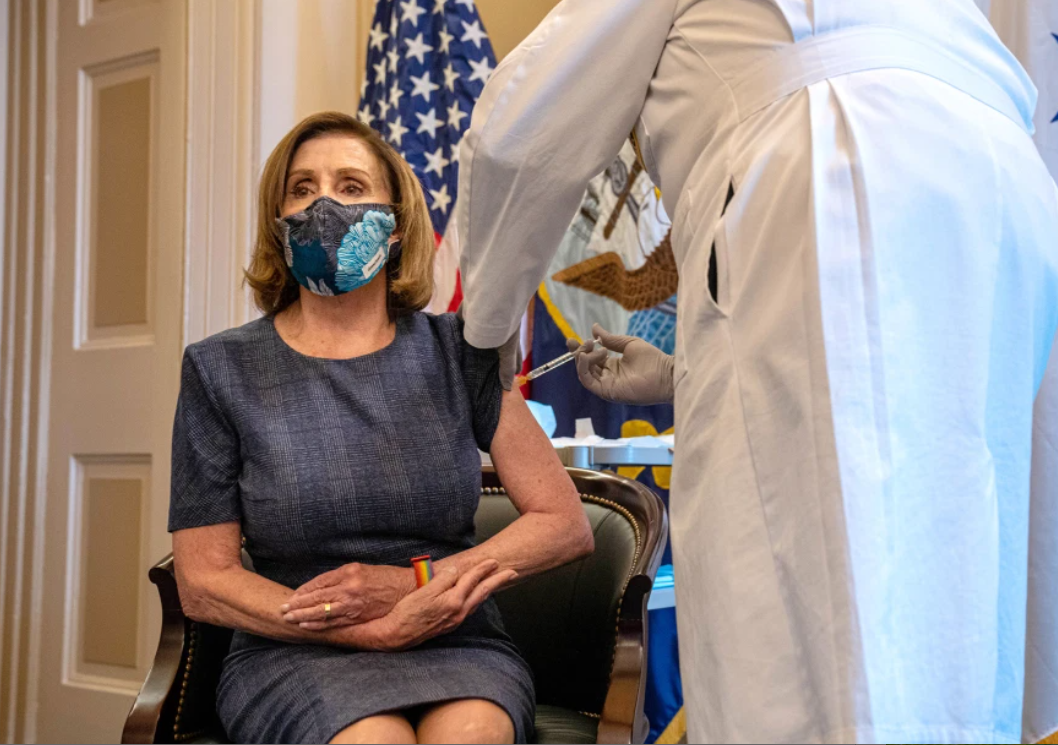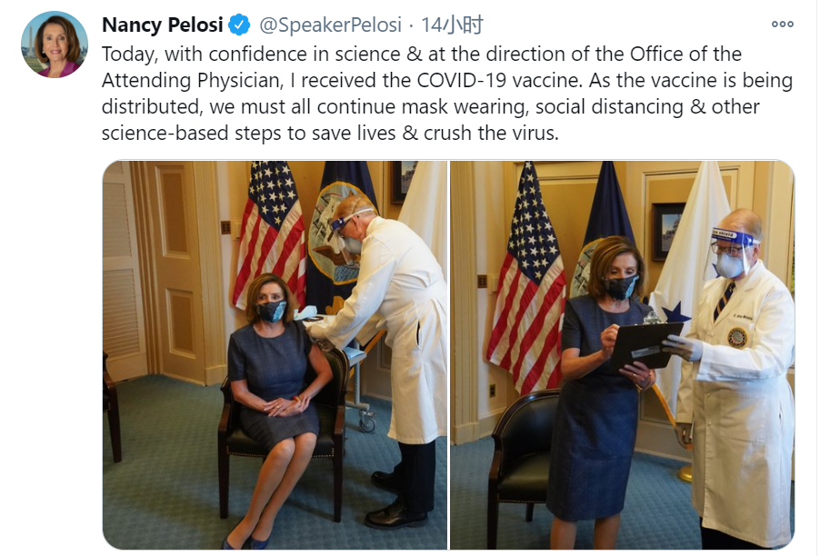 當地時間18日,佩洛西發推公開自己接種了新冠疫苗:“今天,我懷着對科學的信心,在(美國國會)主治醫師辦公室(OAP)的指導下接種了新冠疫苗。在分發疫苗的同時,我們必須繼續戴口罩、保持社交距離並(遵循)其他以科學為基礎的步驟,以拯救生命,摧毀病毒。”