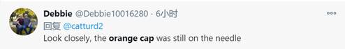 甚至有一名美國網友因此質疑説,“如果你覺得接種疫苗是認真的,再看看。南希沒有接種。橙色帽子還留在針上。新冠病毒是個謊言。”