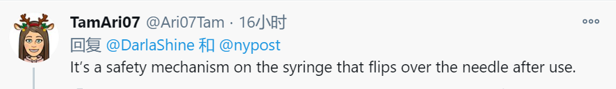 “這是注射器上的一個安全裝置,使用後它會翻轉針頭的。”