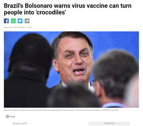法新社:巴西總統博索納羅警告,新冠疫苗能把人變成“鱷魚”