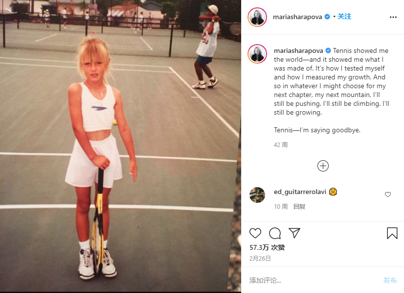 今年2月,莎拉波娃在ins上po了一張自己小時候練習網球時的照片,並宣佈自己退役的消息: