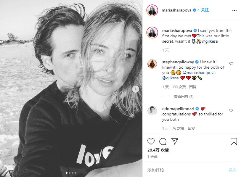 18日,33歲的網壇名將、最美網球天后瑪利亞·莎拉波娃(Maria Sharapova)在ins上分享了自己與男友Alexander Gilkes訂婚的喜訊。