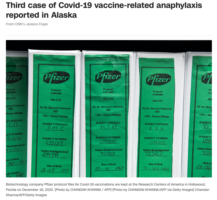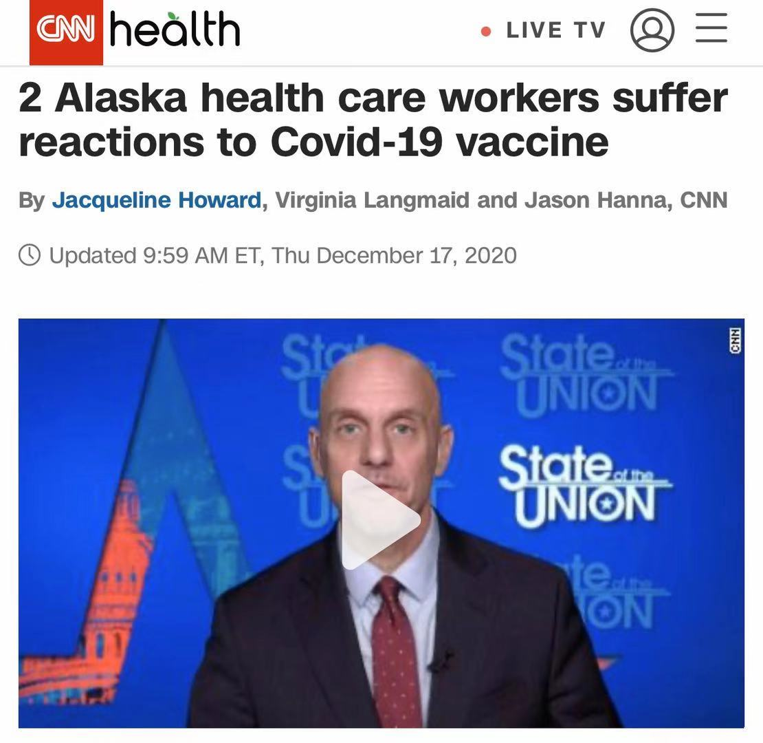 △CNN18日報道,阿拉斯加州出現第三例醫護人員接種疫苗後產生不良反應案例
