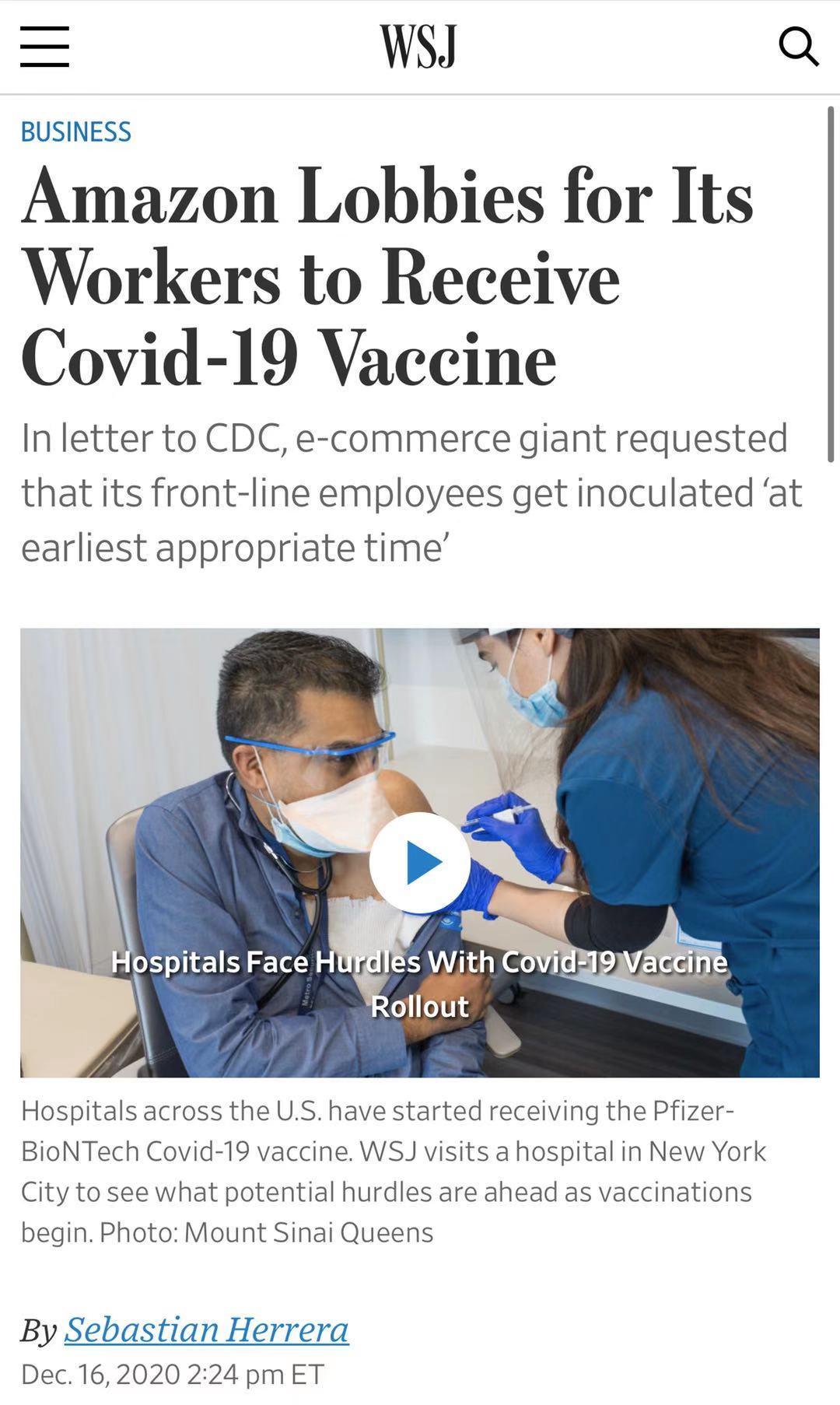 近日,美國亞馬遜公司就被曝出正在遊説疾控中心,試圖將其員工列入“必要工作人員”名單,從而早於普通人獲得疫苗。而且,據《華爾街日報》報道,疾控中心已經收到了來自餐飲業、航空業和房地產業的多個巨頭公司的類似申請。
