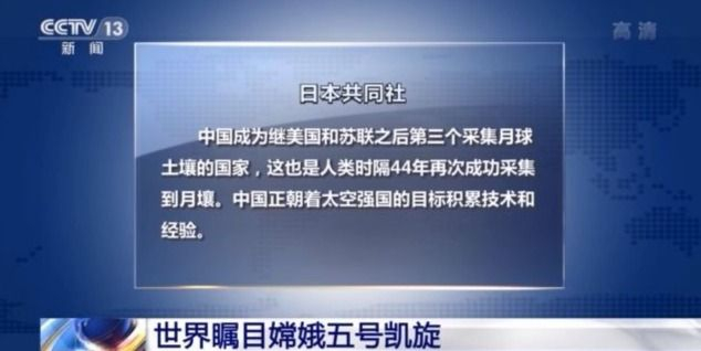 日本共同社報道説,中國成為繼美國和蘇聯之後第三個採集月球土壤的國家,這也是人類時隔44年再次成功採集到月壤。 中國正朝着太空強國的目標積累技術和經驗。