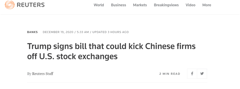 路透社報道稱,儘管該法案適用於任何國家的公司,但其目的是針對在美國上市的中國公司,如阿里巴巴、拼多多等。