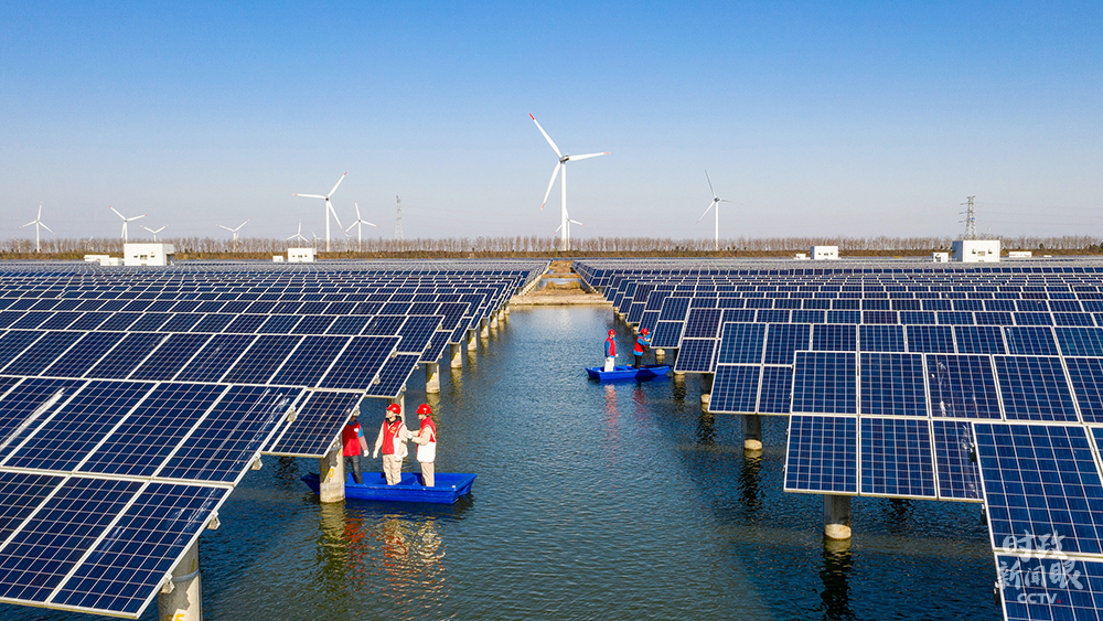 △江蘇海安,電力作業人員正在巡檢光伏發電設施。