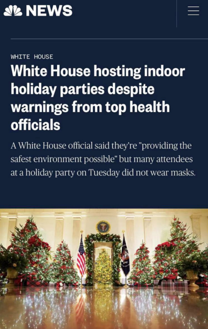 △美國全國廣播公司報道,節日期間,白宮計劃舉辦多達20場室內聚會