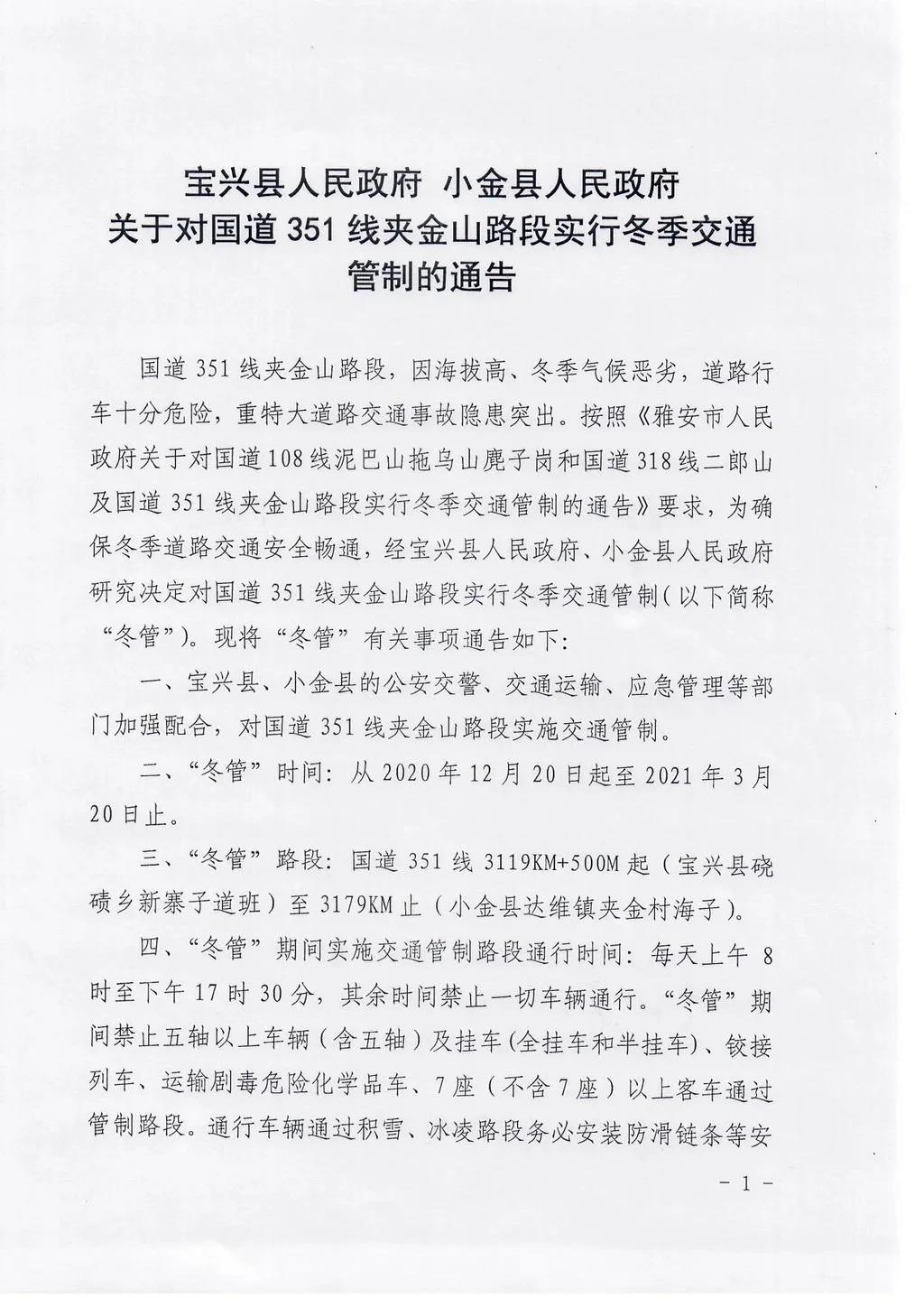 由於G351線夾金山路段海拔高,冬季氣候惡劣,道路行車十分危險,重特大道路交通事故隱患突出,12月20日起,四川將對國道351線夾金山路段實行冬季交通管制(以下簡稱“冬管”)。