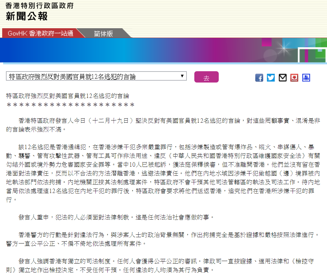 港府新聞公報截圖