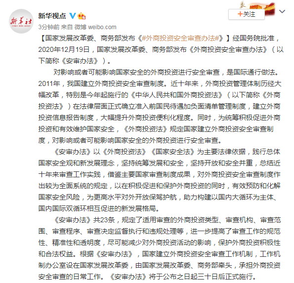 經國務院批准,2020年12月19日,國家發展改革委、商務部發布《外商投資安全審查辦法》(以下簡稱《安審辦法》)。