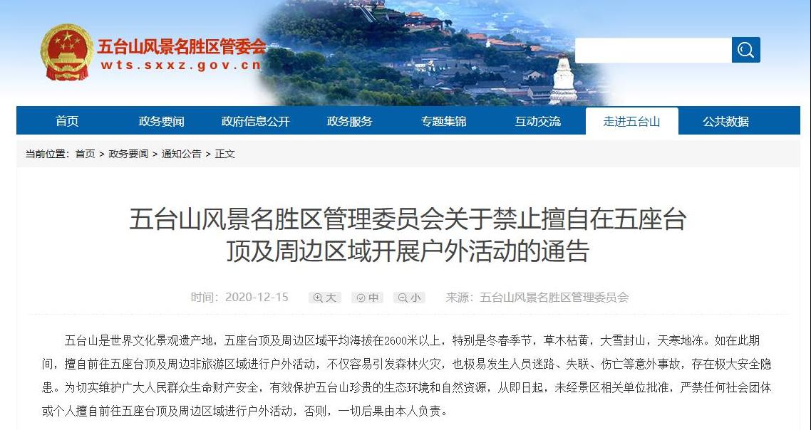 近日,山西五台山風景名勝區管理委員會發布公告,為切實維護廣大人民羣眾生命財產安全,有效保護五台山珍貴的生態環境和自然資源,即日起,未經景區相關單位批准,嚴禁任何社會團體或個人擅自前往五座台頂及周邊區域進行户外活動。