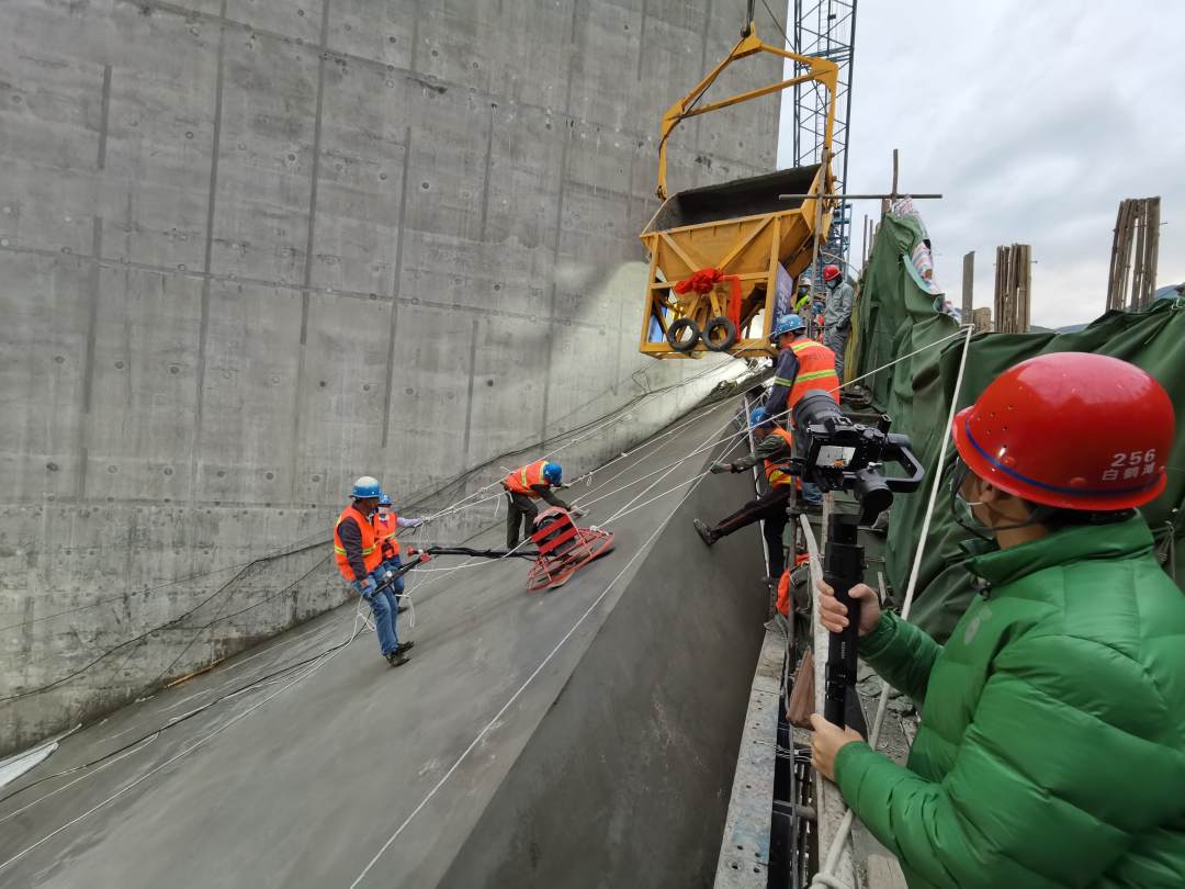 受高速水流空化、氣蝕影響,泄洪建築物是電站運行期間最易出現破壞的工程部位,多年來行業內一直在探索水工隧洞高質量混凝土襯砌的可能,卻始終未能取得突破。白鶴灘水電站泄洪洞工程首次實現全過流面澆築低坍落度混凝土,並研發基於薄壁結構襯砌混凝土的智能温控技術,解決了襯砌混凝土“無襯不裂”的世界難題,發明“施工縫無縫銜接工藝”等一系列創新工藝,徹底解決了襯砌混凝土施工質量頑疾,過流面達到了2米靠尺檢查不平整度小於3毫米的標準,實現了體型精準、平整光滑、無缺陷,養護狀態下呈現鏡面映射效果,在行業內被譽為“鏡面混凝土”,確保了泄洪建築物運行期安全,成為白鶴灘水電站世界一流精品工程的一張名片。