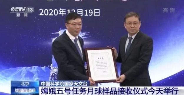 總枱央視記者 帥俊全: 我現在就是在中國科學院國家天文台的多功能廳,今天這裏備受關注,因為我國首次月球採樣返回獲得樣品今天上午就來到了這裏,並舉行了嫦娥五號任務月球樣品的接收儀式。儀式上,在全場人員的掌聲中,月球樣品轉運隊將月球樣品送到了會場上。中國科學院院長將月球樣品交付給了國家天文台,同時也頒發了一份責任狀。月球樣品來之不易、極為珍貴,所以責任狀也是沉甸甸的。
