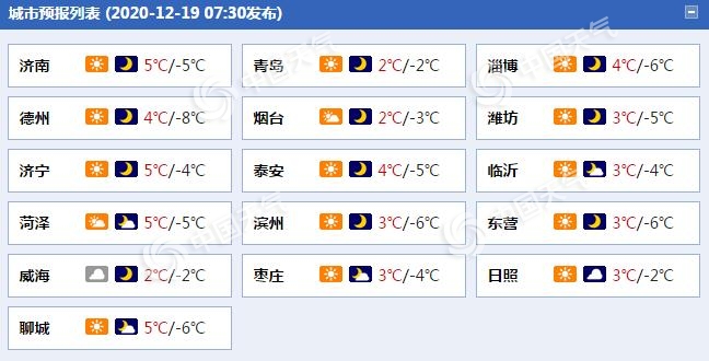 20日白天到夜間,全省天氣多雲間晴。夜間最低氣温:魯西北、魯中山區和半島內陸地區-7℃左右,半島沿海地區0℃左右,其他地區-5℃左右。