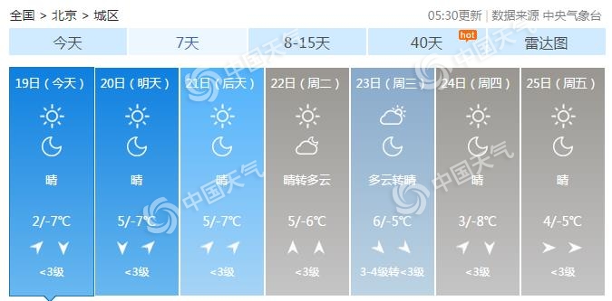 預計雙休日兩天,北京依然晴天佔據“主場”。根據北京市氣象台今早6時發佈的最新預報,今天白天,北京晴間多雲,北轉南風2、3級,最高氣温2℃;夜間晴,南轉北風2、3級,最低氣温零下7℃。