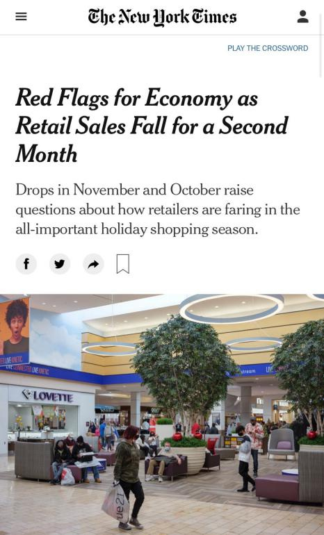 △《紐約時報》報道,美國11月零售額下滑1.1%,為經濟復甦敲響警鐘