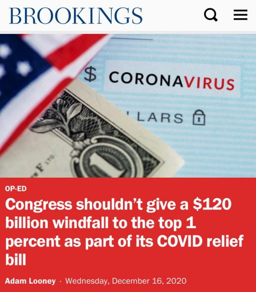 △布魯金斯學會認為,美國國會即將出台的新一輪紓困措施,可能包含1200億美元送給富人的“禮物”